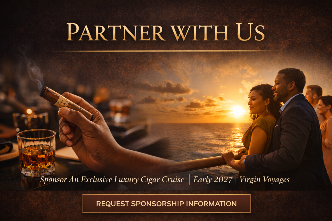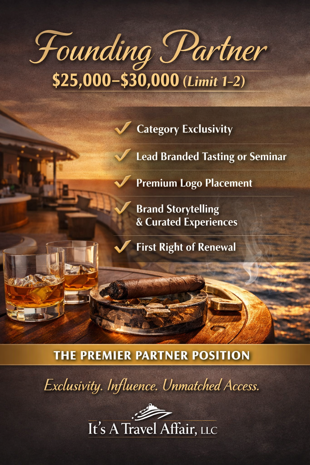Our tiered investment levels are designed to maximize your return by aligning your brand with visibility, access, and influence—whether you want premium brand dominance or targeted, high-impact engagement. Each level offers a clear pathway to connect with qualified cigar enthusiasts, build authentic relationships, and turn meaningful moments at sea into long-term brand loyalty and measurable sales.